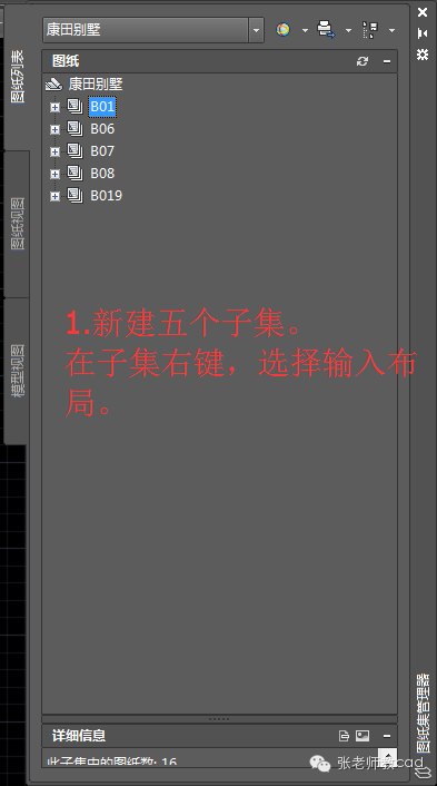 这些是我现在使用的画图,个人很此方式的画图效果。 有几个优势 图纸文件中的成品图中,布局无图元,模型与布局完全相同。方便其他专业参照图纸。同时可以将所有单个图纸,参照到统一一个图纸中,方便不习惯此方式的人看图。 不使用注释性功能,但通过外部参照,同样得到同步更新大样图,方便与其他专业不会注释性的交接。(之前用注释性画图,与其他专业交接痛苦不堪,本楼主) 一个图纸一个布局一个单元,简化图纸大小,使图纸在后期的时候不会越画越大,大大加快画图速度。(有人担心,不是所有图在一个dwg文件中,会很不习惯,觉的画图会变慢;其实不会,你实际使用之后,你就会发现,其实是会加快画图的。) 通过图纸的拆分成多个图纸(平面、标高、索引、编号......),可以更加精细化控制图纸,通过组合控制,得到不同的图纸,但却可以实现改一个其余全改。 通过图纸集管理,来实现自动打印打包,提高效率。